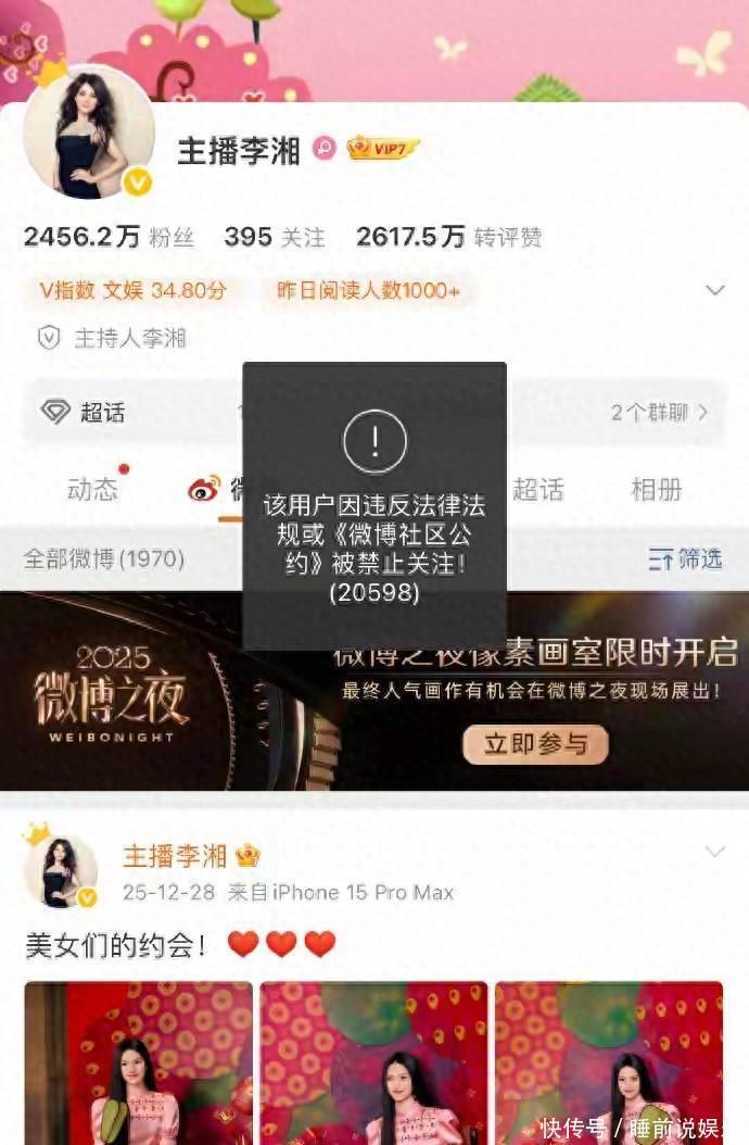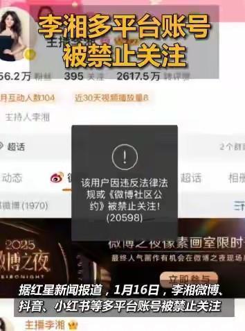 在阅读此文之前,麻烦您点击一下“关注”,既方便您进行讨论和分享,又能给您带来不一样的参与感,感谢您的支持。今天娱乐圈又爆出了一颗超级重磅炸弹,简直像在平静的湖面扔下了一颗巨型深水炸弹,激起千层浪!2026日,这一天注定要被载入娱乐圈的“吃瓜史册”。知名主持人李湘,在微博、抖音、小红书等主流社交平台上的账号,竟然同时被禁止关注了!平台给出的提示是“违反法律法规或《社区公约》”,可具体是违反了哪一条,犯了啥事儿,却像藏着掖着似的,一个字都没透露。这消息一出来,整个网络瞬间就炸锅了,吃瓜群众们纷纷涌入各大平台,各种猜测和讨论像潮水一般涌来。